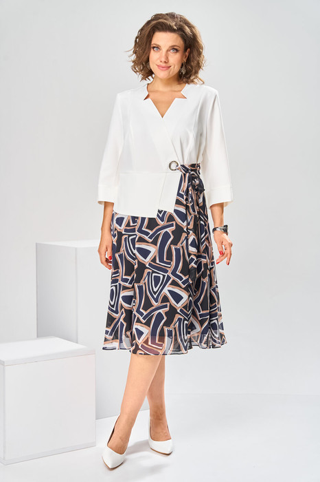 Платье женское относится к нарядной торжественной одежде, но может использовано и при повседневной носке. Платье женское, отрезное по линии талии, расширенное к низу, длиной за колено. Верхняя часть переда с отрезными рельефами, выходящими из плечевых швов, центральная часть с зафиксированным запахом. Верхняя часть спинки со средним швом и 2-мя рельефами, выходящими из плечевых швов. Горловина с V-образным вырезом, фигурная, обточная без воротника. Нижняя часть переда и нижняя часть спинки цельнокроеные, выполнены из отделочной ткани. Шов соединения верхней и нижней частей платья декорирован притачной фигурной отлетной баской. Платье с декоративным поясом из отделочной ткани, закреплённом на левом боковом шве и фиксирующимся в бант через металлическую пробивную блочку на центральной части переда. Рукав одно шовный втачной, длиной до локтя, с притачной фигурной манжетой. Платье с плечевыми накладками. Нижняя часть на подкладке. Длина платья 112 см, длина рукава 33 см.