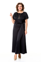 Платье женское, предназначено для повседневной носки. Платье женское, полу прилегающего силуэта, длиной за колено. Перед отрезной, ниже линии талии на 6 см; верхняя часть переда с 2-мя нагрудными выточками и средним швом, нижняя часть с отрезным бочком, шов соединения ею с передом, заканчивается шлицей, фиксирующейся на 3-и обмётанные петли и 3-и пришивные пуговицы; шов соединения часть переда декорирован 2-мя клапанами с закруглёнными концами закреплены на перед пришивными пуговицами. Спинка отрезная ниже линии талии на 6 см; верхняя часть с 2-мя таллиевыми вытачками и средним швом, нижняя часть с 2-мя таллиевыми выточками. Горловина с фигурным вырезом, обтачная без воротника. Платье со спущенным плечом. Рукам втачной, одно шовный, длиной за локоть. Платье без плечевых накладок. Длина спинки 105 см. Длина рукава+плечо 48 см.