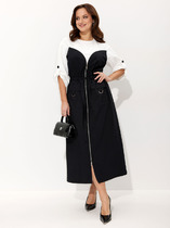 Платье женское, предназначено для повседневной носки. , так же может использоваться как нарядная одежда. Платье женское, длинное, слегка расширенное к низу. Перед с 2-мя отрезными бочками от подреза на уровне линии талии. Спинка отрезная по линии талии. Шов соединения деталей платья платья по линии талии с надстрочной кулисой собранной на эластичную тесьму. Низ платья с 4-мя горизонтальными притачными планками, чередующимися по цвету, на 3-х планках по 4-и односторонних маленьких складки по переду и спинки, формирующими расширение к низу. Низ платья с притачным воланам, с лёгкой сборкой по верхнему срезу. Горловина круглая, без воротника. Рукав цельнокроеный, короткий. Горловина и низ рукава обработаны косой бейкой. Платье со съёмным украшением. Платье без плечевых накладок. Длина спинки платья 138 см, ширина рукава под проймой 23 см.
