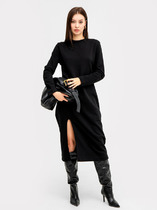Платье полуприлегающего силуэта с вывязанной V-образной формой горловины переда и спинки. Без рукавов. Пройма вывязана по контуру. Перед и спинка выполнены переплетением кулирная гладь. Платье изготовлено из пряжи, в составе которой хлопок, ПАН в сочетании с метанитом.Металлизированная нить в тон пряжи вплетена таким образом, что видна и блестит с лицевой стороны изделия ,придавая ему нарядность.