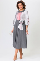 Двубортное платье из костюмной ткани на подкладке. Силуэт платья-слегка приталенный.По переду - нагрудные вытачки, по спинке -рельефы. Бочки, смещенные к переду, делают удобным расположение карманов в швах. Воротник - отложными лацканами пиджачного типа. Рукава - двухшовные, длинные, со шлицей и 2 пуговицами. Жакет застегивается на 2 основные пуговицы, 1 потайную, остальные пуговицы несут декоративный характер.