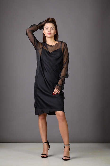 Легкость и шик -идеальное коктейльное платье! Верхнее прозрачное платье из вуали с удлиненными рукавами, длину рукавов можно отрегулировать любыми браслетами. В сочетании с нижним платьем из атласа создаст эффектный образ для прекрасного настроения! Крой по косой нижнего платья обеспечит комфортную посадку на фигуре.