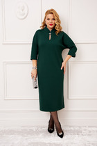 Верхнее платье из шифона свободного кроя расширено к низу, с втачным рукавом. По горловине воротник стойка с застежкой по спинке на две воздушные петли и пуговицы. Рукав длинный расширенный к низу. В боковых швах высокие разрезы.