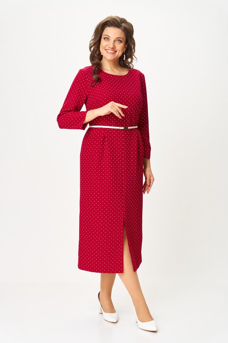 Платье женское полуприлегающего силуэта с втачным рукавом. Перед платья с горизонтальным швом по талии. Верхняя часть с вытачками по линии груди, нижняя часть со складками в области талии и карманами что обеспечивает прекрасную посадку и подчеркивает фигуру. Разрез по переду платья добавляет нотку игривости и удобства. В комплекте съемный ремень.