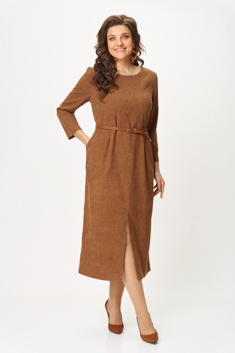 Платье женское из вельвета полуприлегающего силуэта  с втачным рукавом. Перед платья с горизонтальным швом по талии. Верхняя часть с вытачками по линии груди, нижняя часть  со складками  в области талии и карманами что обеспечивает прекрасную посадку и подчеркивает фигуру.  Разрез по переду платья добавляет нотку игривости и удобства. В комплекте съемный ремень.