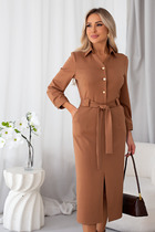 Платье женское прямого силуэта длины миди, с втачным рукавом. Горловина с цельнокроеным воротником стойкой. По горловине и талии вытачки. По переду декоративная планка. Рукав длинный с декоративной планкой из пайеток. По спинке средний шов и потайная застежка молния. В левом боковом шве разрез.