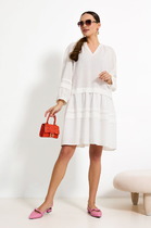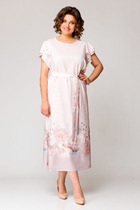 Платье из мягкой вискозной ткани (плательный креп турецкого производства) прямого силуэта. По переду обработаны нагрудные выточки, спинка цельнокроеная. В боковых швах обработаны карманы, по низу боковых швов – разрезы.  Рукав втачной одношовный, со сборкой по шву притачивания манжеты. По низу рукава обработана широкая манжета 10,5 см, застёгивающаяся на 4 пробивные петли и  4 декоративные пуговицы.