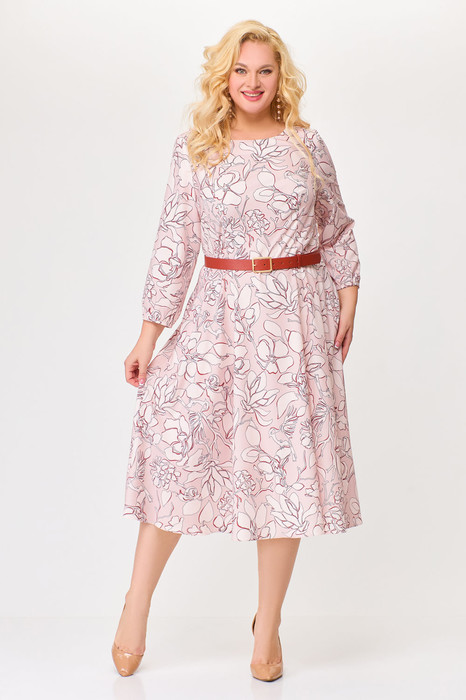 Платье из тонкого текстиля Х-образного силуэта, отрезное по линии талии. По переду и спинке лифа расположены талиевые вытачки. Юбка расклешённая с карманами в боковых швах. В среднем шве спинки предусмотрена молния. Рукав втачной длиной 4/5. Низ рукава собран эластичной тесьмой. длина рукава 51см (±1см).