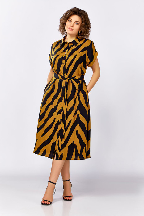 Платье-рубашка из лёгкой вискозной ткани, свободного кроя А-силуэта. Застёжка центральная на петли и декоративные пуговицы. Полочка с нагрудными вытачками, спинка цельная. Воротник рубашечного типа, отложной со стойкой. Пройма спущенная с отложной манжетой. В боковых швах обработаны  карманы. По желанию подчеркнуть талию можно поясом, идущим в комплекте.