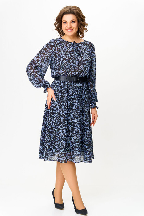 Платье длиной миди, выполнено из шифона на трикотажной подкладке.  Лиф отрезной по линии талии. Талия регулируется эластичной тесьмой (резинкой). Нижняя часть платья А-силуэта.  Подкладка верхней части платья на бретелях. Рукав втачной  длинный, в нижней части собран на эластичные строчки, которые внизу образуют рюшу . Горловина округлой формы, по центру переда капелька с завязкой.