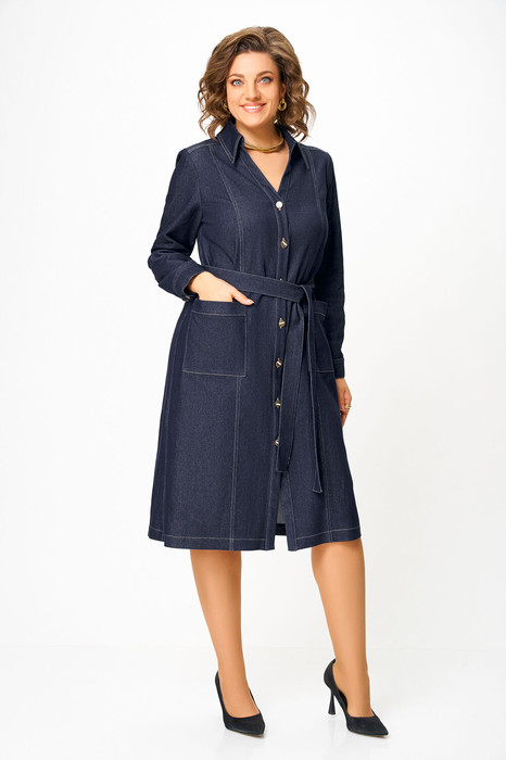 Платье из джинсовой ткани прямого силуэта с центральной застёжкой на петли и джинсовые пуговицы. Полочки с притачными фигурными планками, с рельефным швом и кокеткой, на уровне бёдер накладной карман с планкой и фирменной нашивкой «Swallow».