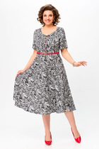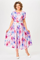 Платье женское, прямого силуэта с коротким рукавом. Рукав со спущенной линией плеча. Воротник рубашейчный, на стойке. Застежка до линии талии, с отрезной планкой на петли и пуговицы. Из под кокеток переда и спинки-сборка. По боку платья, шлица. Перед задекорирован принтом с акцентной нашивкой.