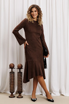 Платье женское, прямого силуэта с длинным рукавом. Рукав со спущенной линией плеча, по низу присобран на манжету. Манжета с застежкой на кнопки, с возможностью регулировки по ширине. Горловина оформлена воротником, с отделочной кнопкой и мягкой складкой по центру переда. По спинке кокетка и складки из под нее. Низ платья фигурной формы с разрезами по бокам. Талия подчеркнута поясом из отделочной тесьмы. Пояс зафиксирован в боковом шве и складке переда/