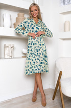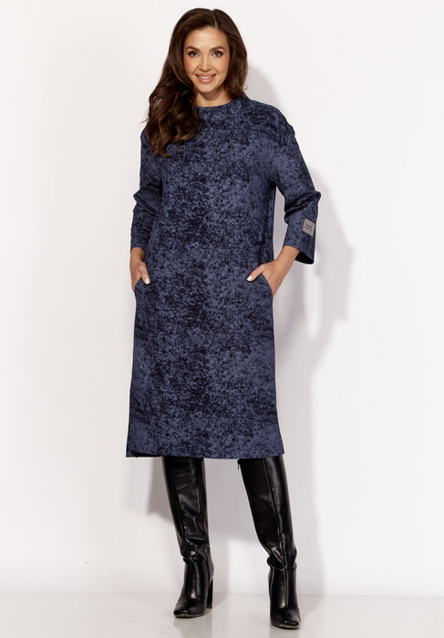 Платье женское, прямого силуэта, с рукавом длинной 7/8. Рукав со спущенной линией плеча. По переду и спинке отрезные кокетки. Спереди рельефные швы от кокетки и функциональные карманы в рельефах. По спинке средний шов от кокетки. Низ платья по спинке удлинен, с разрезами по бокам. Горловина круглой формы, оформлена расширенной стойкой. На рукаве отделочная нашивка.