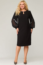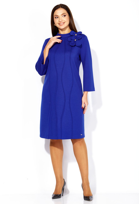 Платье женское, чуть А-силуэта, с втачным рукавом, длинной 7/8. По центру переда объемные, фигурные рельефы. Горловина оформлена небольшой мягкой стойкой. Декором служат съемные цветки-броши. По низу платья отделочная нашивка. Спинка со средним швом. Платье изготовлено из трикотажного полотна "тенсел".