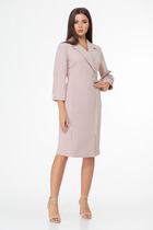 Перед платья асимметричный с наклонным подрезом, нагрудными вытачками, шлицей в среднем шве, рельефами и двумя парами карманов (накладные и внутренние в шве рельефа). Застёжка центральная бортовая на 4 петли и пуговицы. Горловина обработана рубашечным воротником. Спинка с подрезом и выходящими из него складкой и декоративной шлёвкой. В боковых швах обработаны разрезы. Рукав втачной с отрезной манжетой на пуговице, длиной 3/4.