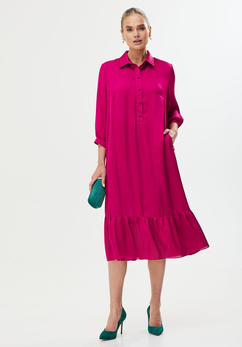 Свободное платье из креп-шифона в сочном оттенке фуксия. В нем будет легко и комфортно в жаркую погоду. Подкладка выполнена из 100% вискозы. Платье не будет сковывать движений и подойдет, как для повседневного использования, так и для торжественных мероприятий. Свободный крой, рукав 3/4, пуговицы в воротниковой зоне - все конструктивные элементы продуманы для Вашего комфорта. Модель украшена небольшими воланами по подолу.