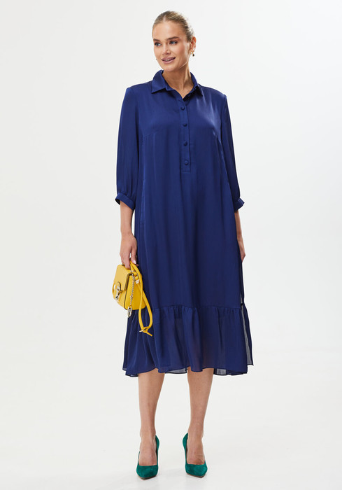 В свободном платье в сочном фиолетовом оттенке будет легко и комфортно в жаркую погоду. Подкладка выполнена из 100% вискозы. Платье не будет сковывать движений и подойдет, как для повседневного использования, так и для торжественных мероприятий. Платье из жатой ткани, приятной на ощупь - визитная карточка бренда Твой Имидж. Свободный крой, рукав 3/4, пуговицы в воротниковой зоне - все конструктивные элементы продуманы для Вашего комфорта. Модель украшена небольшими воланами по подолу.