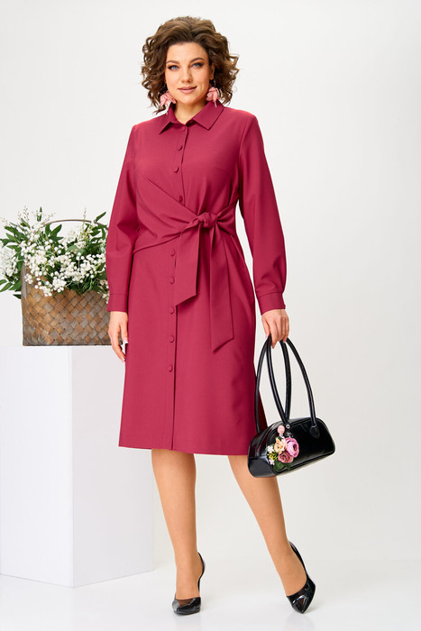 Платье полуприлегающего силуэта, длиной миди. Перед платья с нагрудными вытачками, с цельнокроеной планкой, которая застёгивается на петли и обтяжные пуговицы. Правая делать переда, в области талии, образует мягкую драпировку, переходящую в пояс. По левой стороне деталь пояса вставлена в боковой шов. Спинка цельнокроенная, с талиевыми выточками. Обратите внимание на разрезы по боковым швам, они обязательно пригодятся. Рукава втачные, длинные, с притачной манжетой, которая застёгивается на петли и пуговицы. Горловина обработана стойкой с воротником рубашечного типа.
