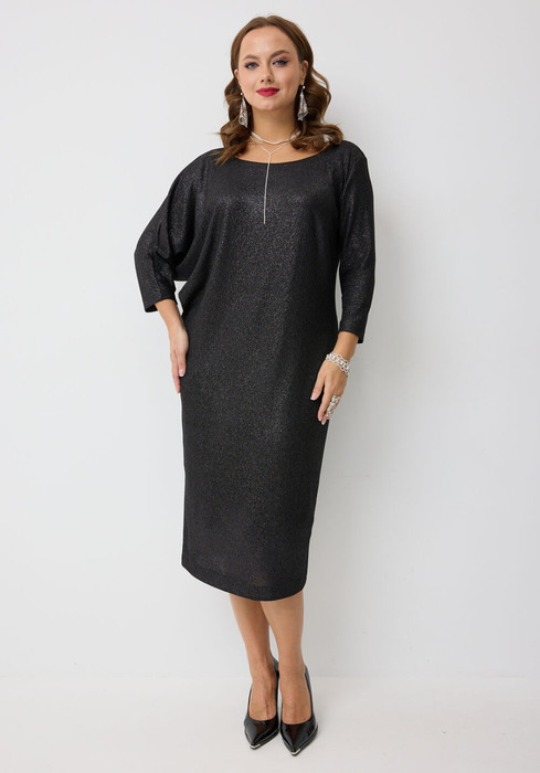 Платье полуприлегающего силуэта комбинированного покроя, выполненное из трикотажного полотна с люрексом. Горловина по переду оформлена в форме"лодочка",  по спинке - аккуратный V- образный вырез. Один из рукавов втачной, другой формы" летучая мышь", длиной 3/4.