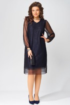 Платье прилегающего силуэта, длиной миди, выполненное из плательной поливискозы. Платье жакетного типа с ассиметричным передом. Одна из сторон переда имитирует жакет и юбку, другая-платье. Перед с талиевыми вытачками с подрезом. В области груди настрочена декоративная листочка, в области бедер - карманы-обманки с листочками и клапаном. По переду обработан разрез. В области талии расположена застёжка на 2 петли и крупные декоративные пуговицы. Спинка со средним швом, в который вставлена потайная молния. Рукав 2-х шовный втачной, длиной 3/4.