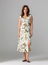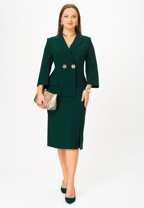 Платье прилегающего силуэта, длиной миди, выполненное из плательной поливискозы. Платье жакетного типа с ассиметричным передом. Одна из сторон переда имитирует жакет и юбку, другая-платье. Перед с талиевыми вытачками с подрезом. В области груди настрочена декоративная листочка, в области бедер - карманы-обманки с листочками и клапаном. По переду обработан разрез. В области талии расположена застёжка на 2 петли и крупные декоративные пуговицы. Спинка  со средним швом, в который вставлена потайная молния. Рукав 2-х шовный втачной, длиной 3/4.