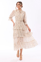 Нижняя часть переда и спинки (юбка) расклешенная к низу, двухслойная: нижний слой из плательной ткани, верхний слой из сетки, по срезу талии собранный на сборку.