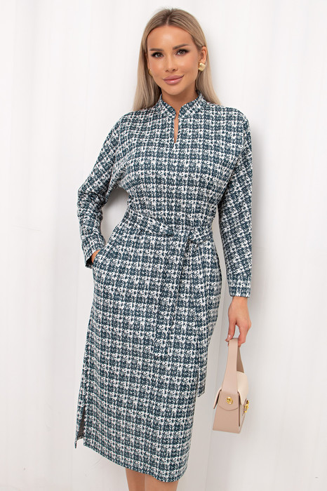 Лаконичное платье прямого силуэта выполнено из трикотажного полотна. Длинный цельнокроеный рукав летучая мышь, оканчивается притачной манжетой. Горловина оформлена воротником - стойка. По переду застежка на потайную молнию. По боковым швам расположены функциональные карманы. Низ ровный, по бокам разрезы. Пояс из основного материала в комплекте.