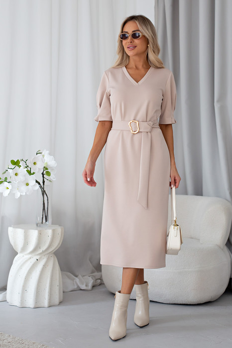 Лаконичное платье полуприлегающего силуэта изготовлено из трикотажного полотна.V-образная горловина. Короткий втачной рукав оформлен с встречными складками. Низ ровный, по спинке шлица. Пояс из основной ткани в комплекте.