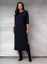 Элегантное платье прямого силуэта изготовлено из трикотажного полотна. V-образная горловина на внутренней обтачке. Втачной рукав фонарик со спущенным плечом. Низ ровный, без разрезов. Модель дополняет пояс с отделкой.