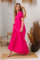Женственное платье полуприлегающего силуэта изготовлено из трикотажного полотна.V-образная горловина. По переду имитация двубортной застежки. Втачной рукав фонарик оканчивается притачной манжетой. Модель отрезная по линии талии. В боковом шве застежка на потайную молнию. Двойной перед имитирует юбку с запахом. Низ ровный, сзади разрез.
