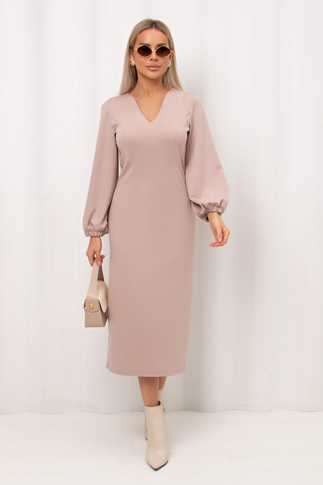 Женственное платье полуприлегающего силуэта изготовлено из трикотажного полотна. V-горловина на внутренней обтачке. Длинный втачной рукав по низу присобрен на резинку. По среднему шву спинки застежка на потайную молнию. Низ ровный, сзади разрез.