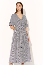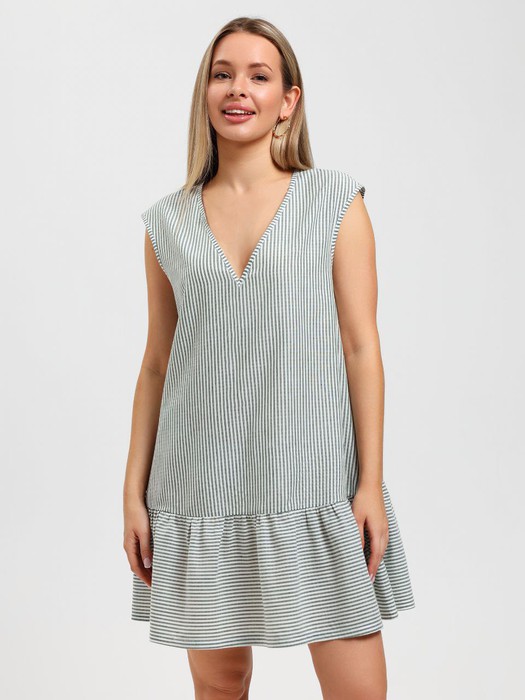 Платье молодежное, свободного покроя, с V- образным вырезом горловины, без рукавов. Горловина и проймы окантованы основным материалом, низ изделия с притачной оборкой. Акцентной деталью платья являются узкие завязки, вставленные в горловину с изнаночной стороны, завязывающиеся на бант спереди, которые при желании изменить внешний вид изделия, могут быть убраны вовнутрь.