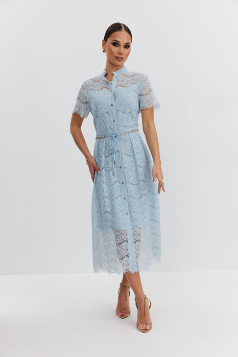 Платье из кружевной ткани полуприлегающего силуэта длины «миди»  расширенное к низу. По талии подрез, нижняя часть платья со встречными складками по талии. По переду планка с застежкой на петли и пуговицы. По горловине стойка. Рукав втачной короткий. Платье на подкладке. Поясок в комплекте.
