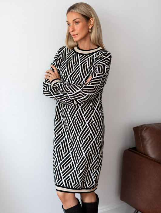 Платье жаккардовой вязки выполнено из мягкой пряжи на основе вискозы с добавлением кашемира. Модель свободного силуэта подходит для любой фигуры. Нежная пряжа очень комфортно ощущается на теле, сохраняя оптимальное тепло при этом не перегревая. Совет стилиста: жаккардовое платье отличная инвестиция в базовый гардероб, которая поможет создать дорогие образы. Носите с высокими сапогами удлиняя силуэт или плотными колготками.