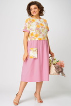 Платье женское полуприлегающего силуэта, зауженное к низу. Перед с декоративными кантами из отделочной ткани из проймы до низа и с вытачками из рельефов. Спинка со средним швом, в котором обработана потайная тесьма-молния и шлица. Также по спинке обработаны талиевые вытачки. Рукав втачной длиной 3/4 фантазийной формы на запах, расширенный к низу, двойной. Обтачен отделочной тканью. Горловина овальной формы.