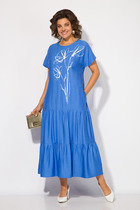 Платье женское полуприлегающего силуэта с естественной линией плеча.Рукав короткий втачной одношовный.Горловина оригинальной авторской формы.По переду выполнены нагрудные и талиевые вытачки.Спинка с вытачками.В среднем шве спинки застежка на потайную тесьму-молнию и шлица.В комплект входит декоративная подвеска.