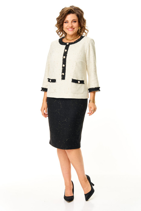 Платье прямого силуэта с естественной линией плеча на трикотажной подкладке. Платье выполнено имитацией жакета и юбки карандаш. Спинка со средним швом и застежкой на молнию. Перед с нагрудными вытачками и накладными карманами. Вырез горловины округлой формы. По горловине и переду настрочены отделочные бейки с необработанным краем. Рукав втачной одношовный длиной 3/4. По низу рукава настрочена отделочная бейка с необработанным краем. На изделие пришиты декоративные пуговицы. Ткань с добавлением шерсти, ворсистой фактуры с вплетением металлизированной нити.