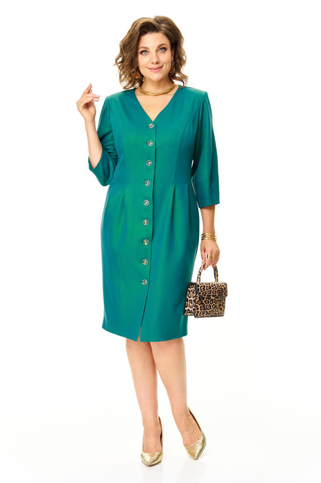 Платье полуприлегающего силуэта с естественной линией плеча.Спинка со средним швом и рельефами из проймы заканчивающимися складками.Перед рельефами из проймы заканчивающимися складками.Застежка центрально-бортовая на петли-пуговицы.Горловина V-образной формы.Рукав втачной одношовный длиной 3/4.По низу рукава выполнены вытачки.Низ рукава обработан обтачкой.