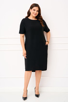 Платье женское полуприлегающего силуэта, заужено к низу. Рукав цельнокроеный типа "летучая мышь" длиной 3/4. Низ рукава обработан притачной манжетой с застежкой на петлю-пуговицу. Горловина обработана блузочным воротником на отрезной стойке. Спинка со средним швом и вытачками. Средний шов спинки с застежкой на тесьму-молнию и шлицей. Перед, до линии талии, с однобортной застежкой на петли-пуговицы. Имеется отделочный навесной пояс контрастного цвета. Для поддержания пояса на линии талии обработаны шлёвки. По переду обработаны карманы с отрезным бочком.