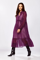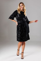 Платье прямого силуэта с естественной линией плеча. Спинка со средним швом и кокеткой. Перед с нагрудными вытачками, накладными карманами и клапанами. По переду обработана отделочная отрезная планка с застежкой на петли-пуговицы. Рукав втачной одношовный длиной 3/4 с отделочной манжетой и патой по низу. На плечевых швах имеются отделочные паты с пуговицами. В боковых швах выполнены невысокие разрезы. На правой стороне переда, по низу, пришита декоративная нашивка. Отделочные строчки контрастного цвета. Вся фурнитура металлическая premium качества.