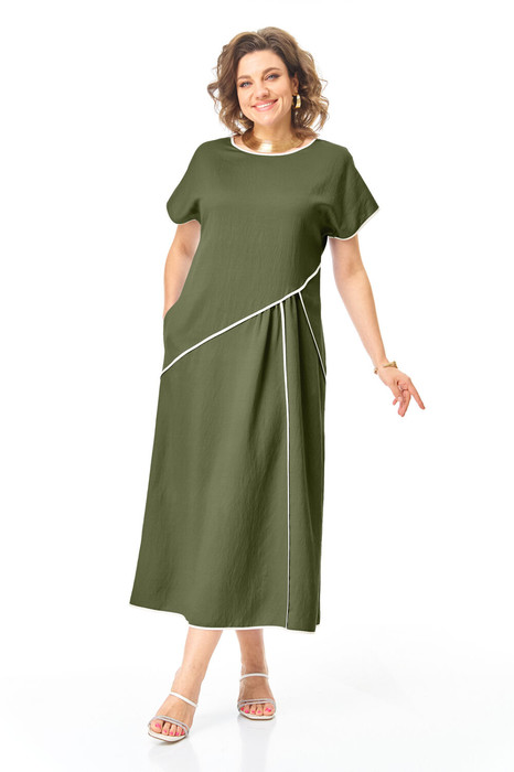 Платье женское А-образного силуэта со спущенной линией плеча. Рукав типа "летучая мышь". Горловина округлой формы. В среднем шве спинки застежка на тесьму-молнию. По переду выполнен ряд ассиметричных подрезов с кантами контрастного цвета и легкая сборка. В боковых швах обработаны карманы. Горловина, низ рукава и платья окантованы тканью контрастного цвета.