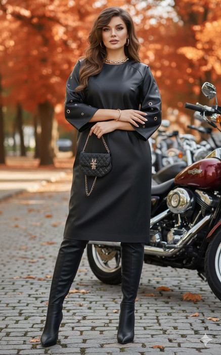 Платье полуприлегающего силуэта с округлой формой горловины. По переду платья нагрудные вытачки. По спинке застёжка на декоративную тесьму молнию  в среднем шве платья и разрезом от низа. Рукава становятся главным акцентом: ряд люверсов и кнопок, выстроенных словно доспехи, придают образу дерзкий, почти урбанистический шик.  Рукав  в платье реглан, расширяется к низу, длиной 7/8. В боковых швах платье карманы. Длина платья 109 см (р 50-54), 111 см (р 56-60). Длина рукава 61 см.