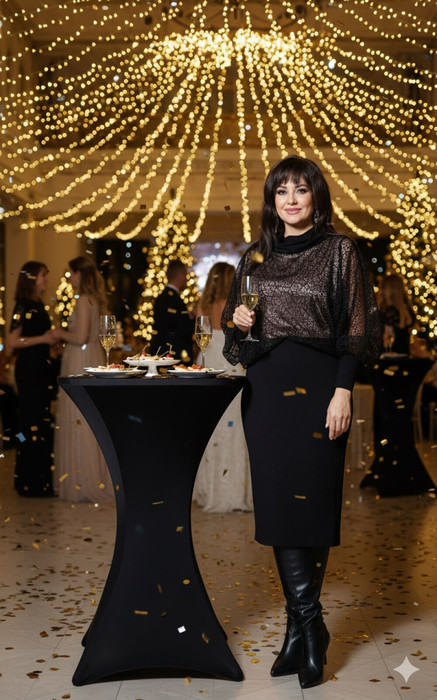 Платье-загадка. В нём ажурная невесомость чёрной сетки на лифе встречается с архитектурной чёткостью воротника-хамута, собранного в изящные защипы. А от него вниз устремляется матовый поток юбки-карандаш, строгий, безупречный и невероятно соблазнительный в своей простоте.  Это платье создано для тех, кто знает силу намёка. Глубокий чёрный цвет здесь не просто окрас, а целая история. Высокий воротник-хамут, пронизанный лучами защипов, обнимает шею, как роскошный ошейник, придавая образу отстранённое благородство и лёгкий флёр декаданса. И в противовес воздушному лифу — юбка-карандаш. Сшитая из плотного, послушного трикотажа, она властно лепит форму, подчёркивая линию бёдер и строгость силуэта. Это диалог нежности и строгости, соблазна и сдержанности. Платье полуприлегающего силуэта, отрезное выше уровня талии. Лиф в платье из сетки, с диагональным рельефом по переду. Рукав в платье цельнокроеный со сборкой на высокий манжет. Для удобного прилегания к руке в манжете застёжка на потайную тесьму молнию. Горловина округлой формы с притачным воротником по форме хомут. Лиф в платье с напуском на юбку платья. Юбка в платье со средним швом по спинке переходящим в разрез от низа. Длина платья 110 см (р 48-52), 110,5 см (р 54-58), длина рукава 65,5 см (р 48-52), 59 см (р 54-58).
