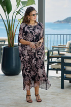 Платье, которое вскружит голову! Оно восхитительно смотрится на фигуре, подчеркивая ваши формы и скрывая недостатки. Представляем вашему вниманию эффектное платье, которое воплощает в себе изысканность и непринужденность. Изготовленное из легкой, полупрозрачной ткани с многослойной структурой, оно создает воздушный и динамичный образ. Узор из стилизованных листьев и абстрактных элементов в приглушенных тонах черного, серого и лилового придает платью особую глубину и выразительность. Свободный крой с короткими рукавами обеспечивает максимальный комфорт и позволяет платью струиться по фигуре, деликатно подчеркивая ее достоинства. Асимметричный низ добавляет современности и легкости, создавая игривый силуэт. Это платье идеально подходит для создания как элегантных дневных, так и вечерних образов, легко сочетаясь с различными аксессуарами. Оно станет незаменимым элементом гардероба для тех, кто ценит комфорт, индивидуальность и утонченный стиль. Верхняя часть платья отлетная на подкладке с цельнокроенным рукавом .Нижняя часть платья с расклешением, низ ассиметричный так же на подкладке. Длина платья от высшей точки плечевого шва до низа 132 см. Длина рукава 24 см (р 52-56), 25,5 см (р 58-62).