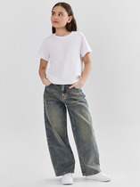 Джинсы для девочки подростка. Впереди застежка на молнию и болт. Внутри пояса — эластичная лента с пуговицами для регулировки. Модель wide leg из плотного черного денима с прямыми широкими штанинами. Посадка классическая по талии, длина — до щиколотки. Спереди два боковых кармана, сзади — два накладных кармана. Декорированы принтами и нашивками. На поясе сзади — брендированный ярлык.
