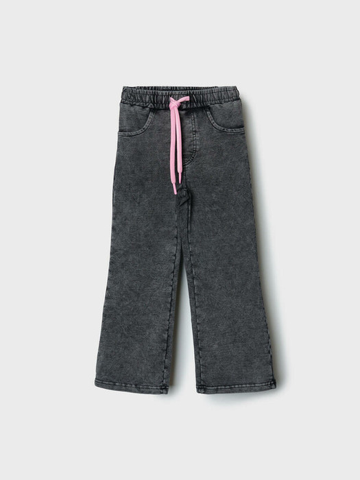 Детские брюки для девочки. Модель клеш, выполнена из мягкого хлопкового трикотажа с эффектом денима. У брюк высокий комфортный пояс на резинке и шнурок для регулировки. Спереди — два удобных кармана.
