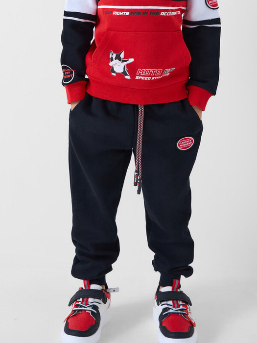 Брюки-джоггеры детские для мальчика. Выполнены из хлопкового трикотажа футер без начеса. Модель прямого кроя со средней посадкой на талии. Пояс выполнен на резинке, дополнительно регулируется шнурком. По бокам — удобные карманы. В нижней части брючин предусмотрены эластичные трикотажные манжеты для лучшей фиксации. Брюки украшены нашивкой в гоночной тематике.