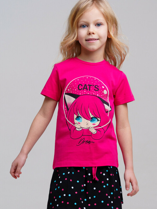 Футболка детская для девочки. Высокое содержание хлопка. Благодаря наличию эластана в составе ткани изделие держит форму и меньше мнется.  Модель выполнена из качественного и приятного на ощупь трикотажа.