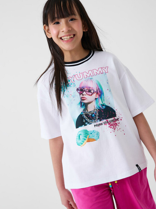 Футболка оверсайз для девочки подростка. Модель выполнена из эластичного хлопкового трикотажа джерси. На груди расположен крупный красочный принт. Горловина круглая, обработана эластичным рибом. В нижней части — небольшая нашивка.
